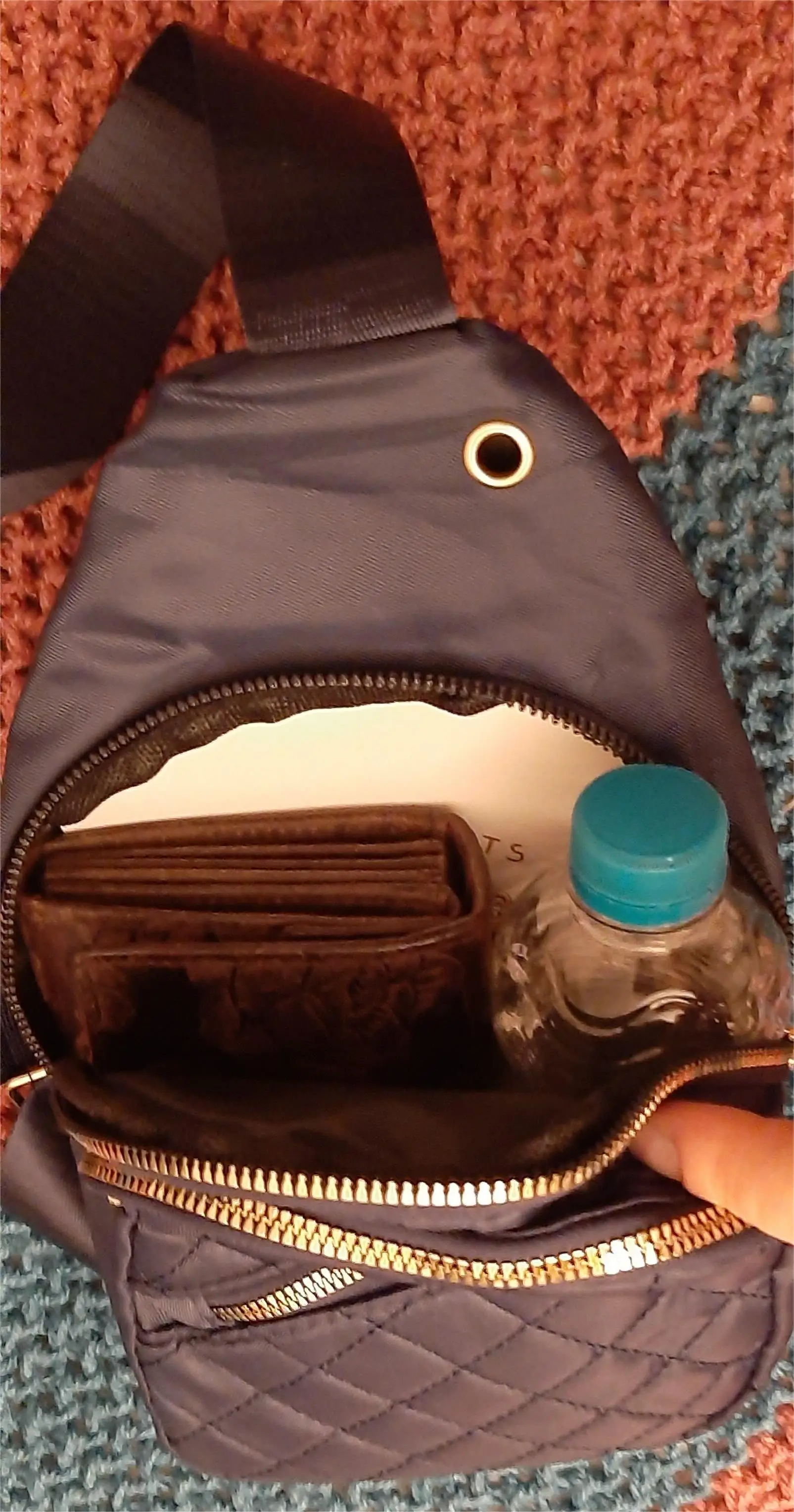 A good bag that is very spacious. It has two compartments and a pocket. It fits a lot inside, as shown in the photo. You can easily store a mobile phone, cosmetics, two half-liter water bottles, a large wallet, and an A5 notebook in it. The long strap is suitable for adults and can be extended to one and a half meters. A very practical bag. I am very satisfied with my purchase.